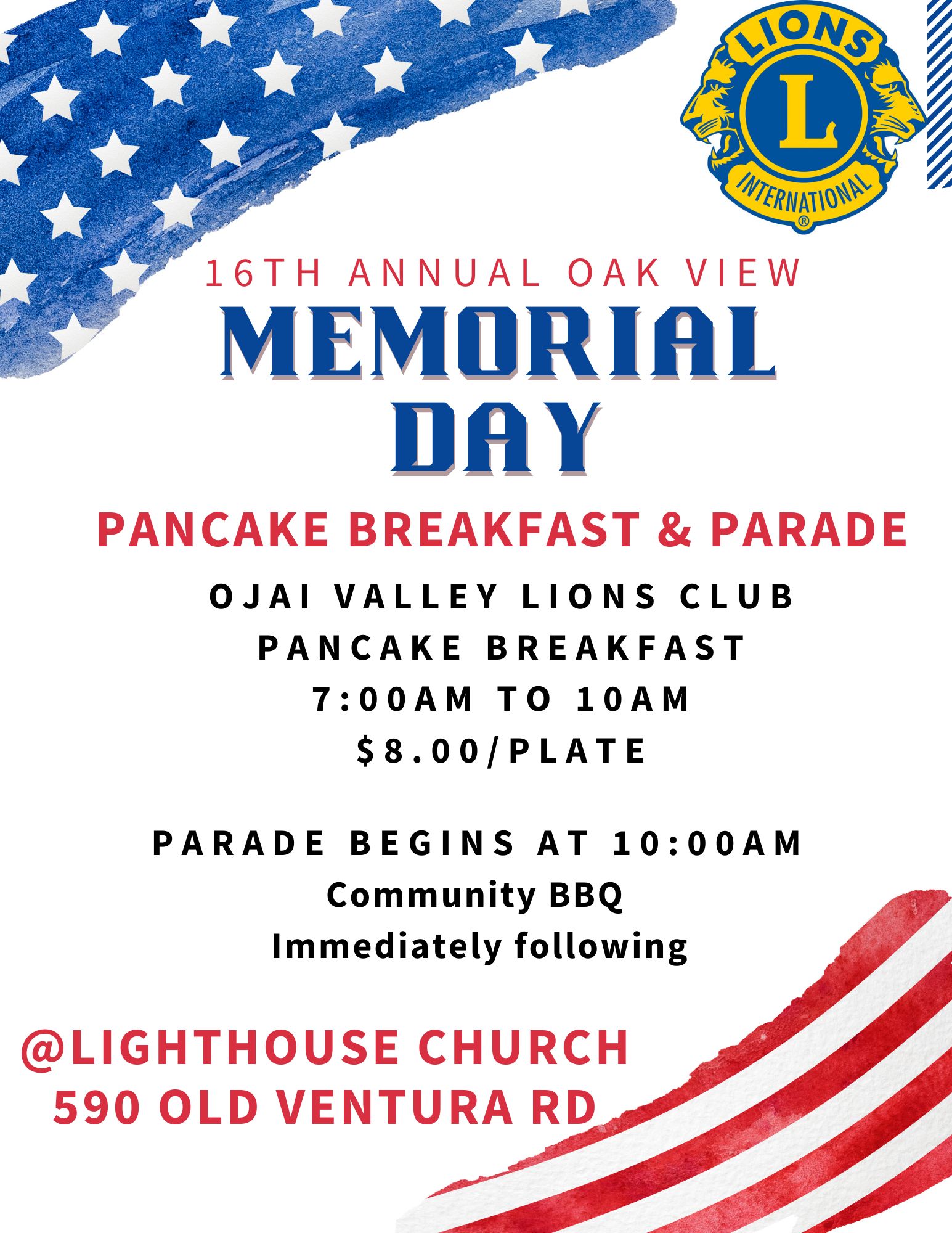 Uncategorized Pancake Breakfast Before Memorial Day Parade Monday May 29, 2023 May 24, 2023 Share this: Click to share on X (Opens in new window) X Click to email a link to a friend (Opens in new window) Email Click to print (Opens in new window) Print More Click to share on Reddit (Opens in new window) Reddit Click to share on LinkedIn (Opens in new window) LinkedIn Click to share on Facebook (Opens in new window) Facebook Click to share on Tumblr (Opens in new window) Tumblr Like Loading... Related #COMMUNITY SPIRIT#Ojai Valley Lions Club Post navigation ← Bowl To Strike Out Cancer! Ojai’s 4th of July Schedule of Events, 2023 → About ojailions View all posts by ojailions → Leave a comment Cancel replyBasic HTML allowed. Δ